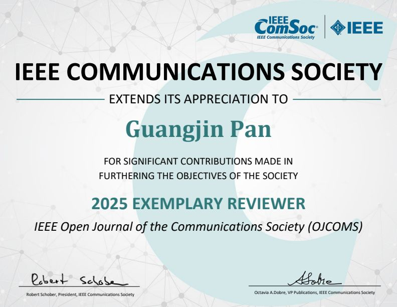 2025.12: 🎉 I am honored and delighted to receive the IEEE Communications Society 2025 Exemplary Reviewer Award for my service to the IEEE Open Journal of the Communications Society.